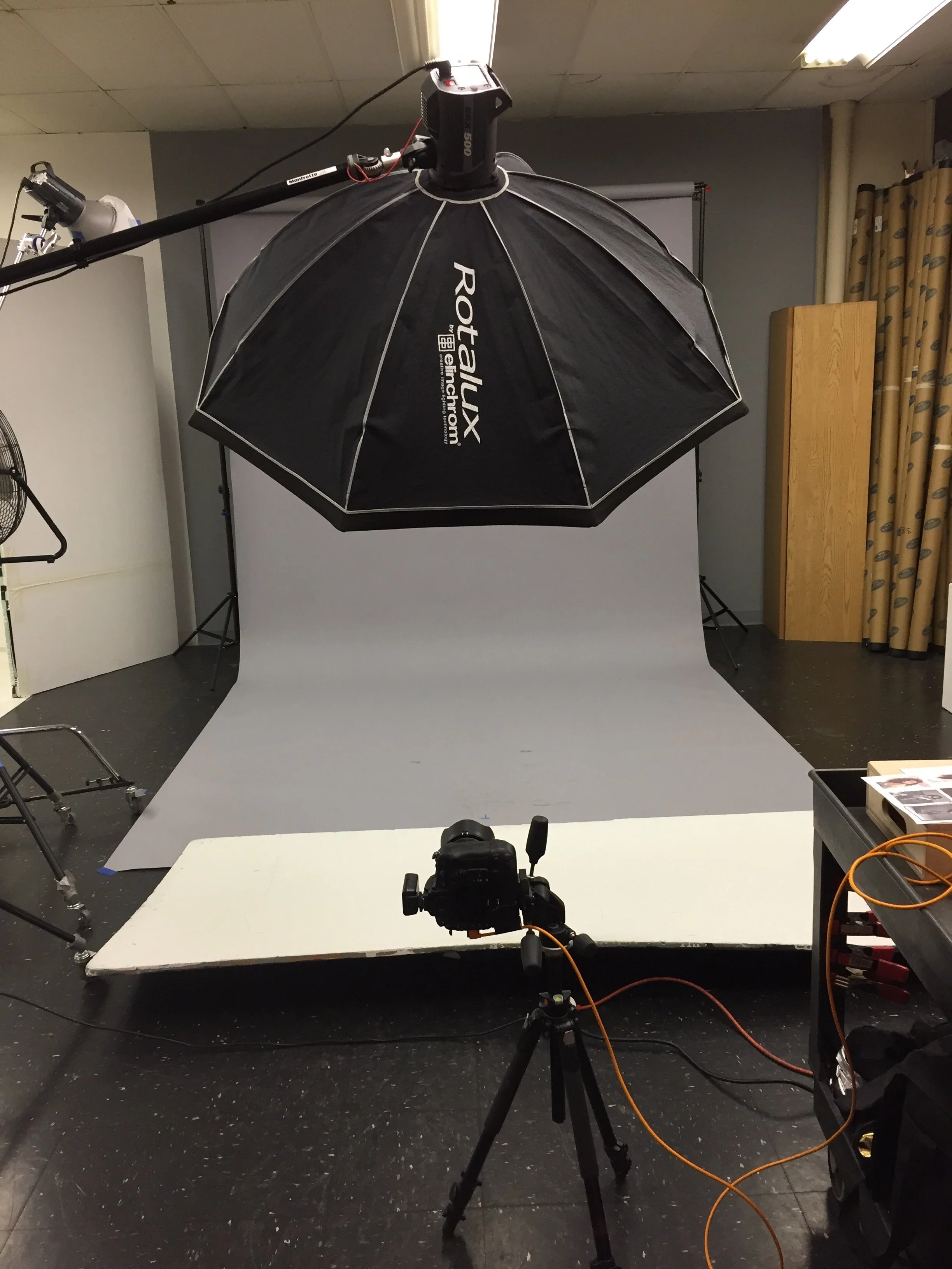 The larger version is the same except I used a 69” Elinchrom Rotalux Octabox on an Elinchrom BRX500 strobe as the top of the clamshell, and an 8’ piece of white foam board as the bottom of the clamshell. The foam board was angled using a studio sandbag. The light was mounted on a Manfrotto super boom. I shot on a Savage Universal Fashion Grey background paper.
